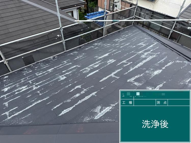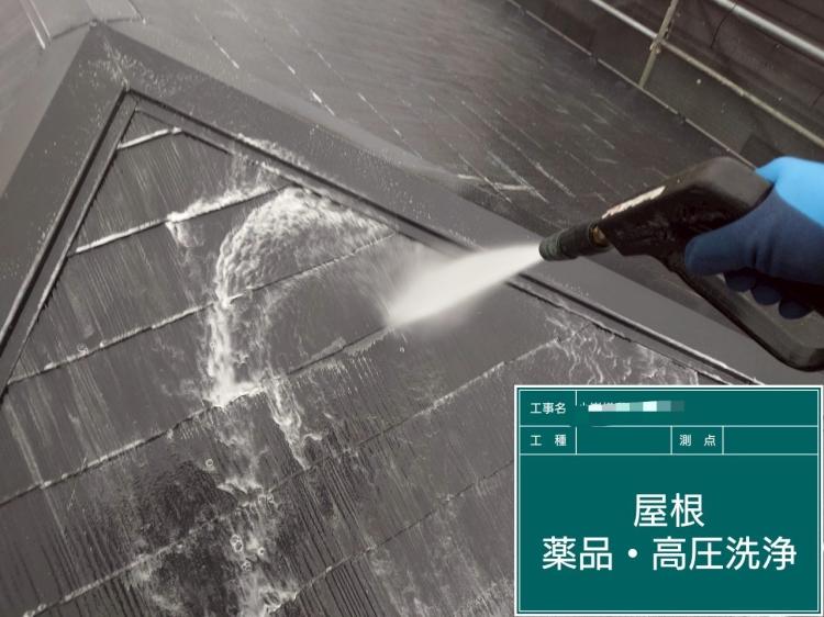 屋根材表面のカビ・コケ・旧塗膜を除去するために、バイオ洗浄剤を使用し高圧洗浄を実施。